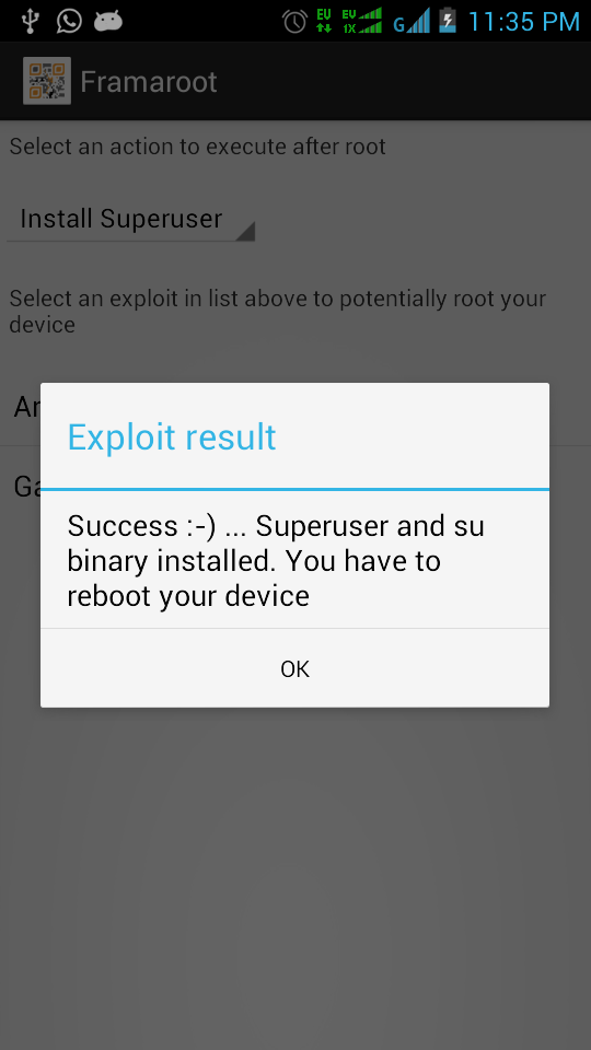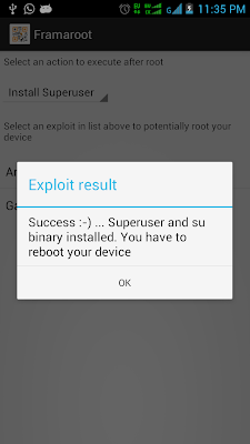 Kalau kurang jelas, itu tulisanya Success :-) … Superuser and su binary installed.. bla bla bla - Kemudian Restart Handphone anda,
